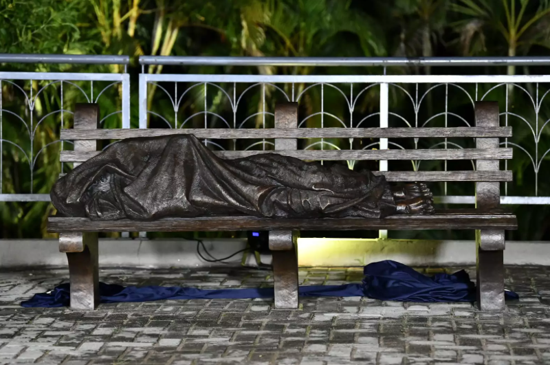 A obra é assinada pelo escultor canadense Timothy Schmalz e compõe a identidade visual da Campanha deste ano. Fundida em bronze e em tamanho natural, a escultura retrata um homem deitado sobre um banco público, coberto por um manto que esconde o rosto e as mãos. Apenas os pés, marcados pelas chagas da crucifixão, permanecem visíveis, revelando tratar-se do próprio Cristo. A proposta artística, inspirada no capítulo 25 do Evangelho de Mateus, convida o observador a reconhecer Jesus na pessoa em situação de rua.
