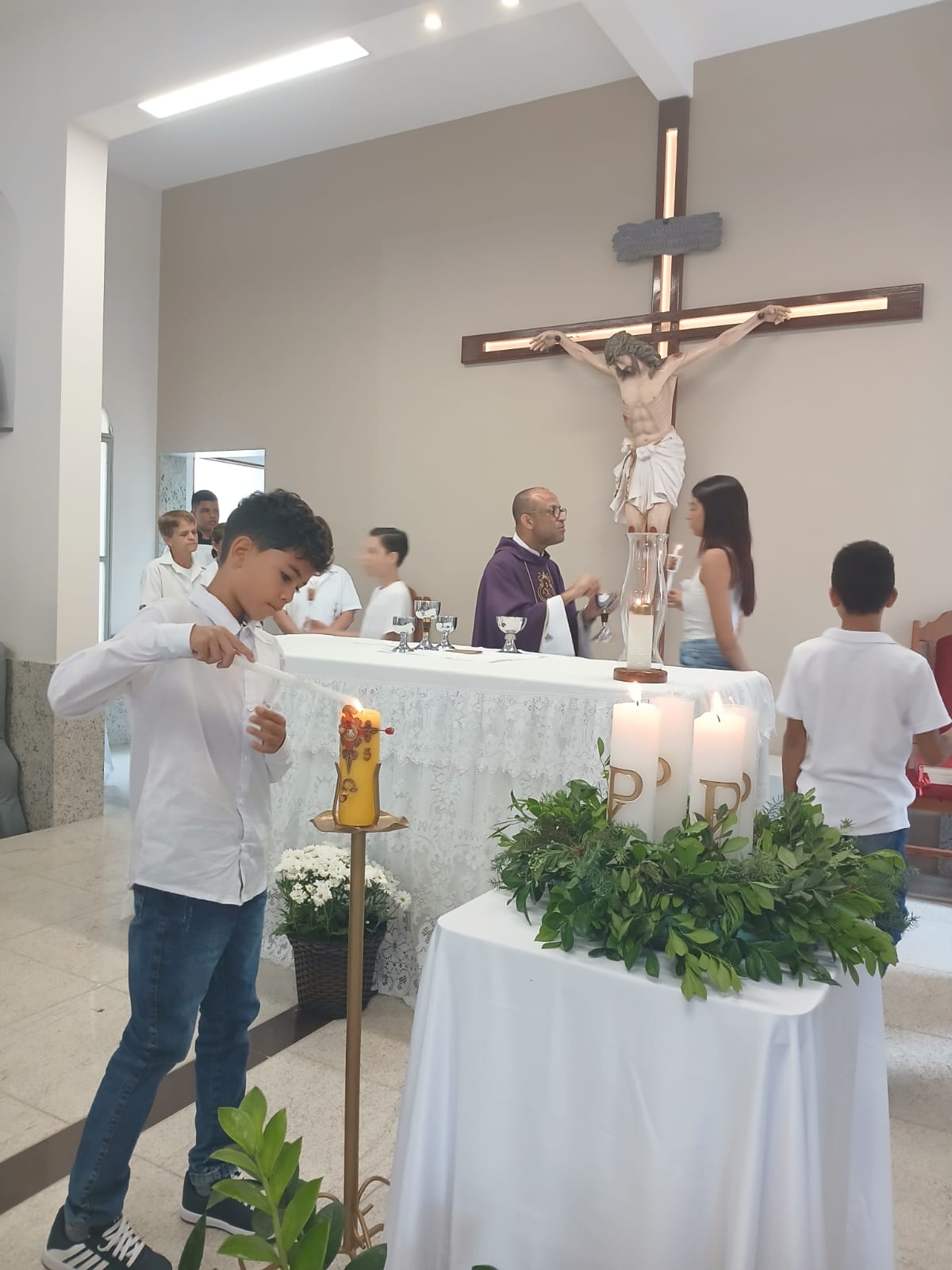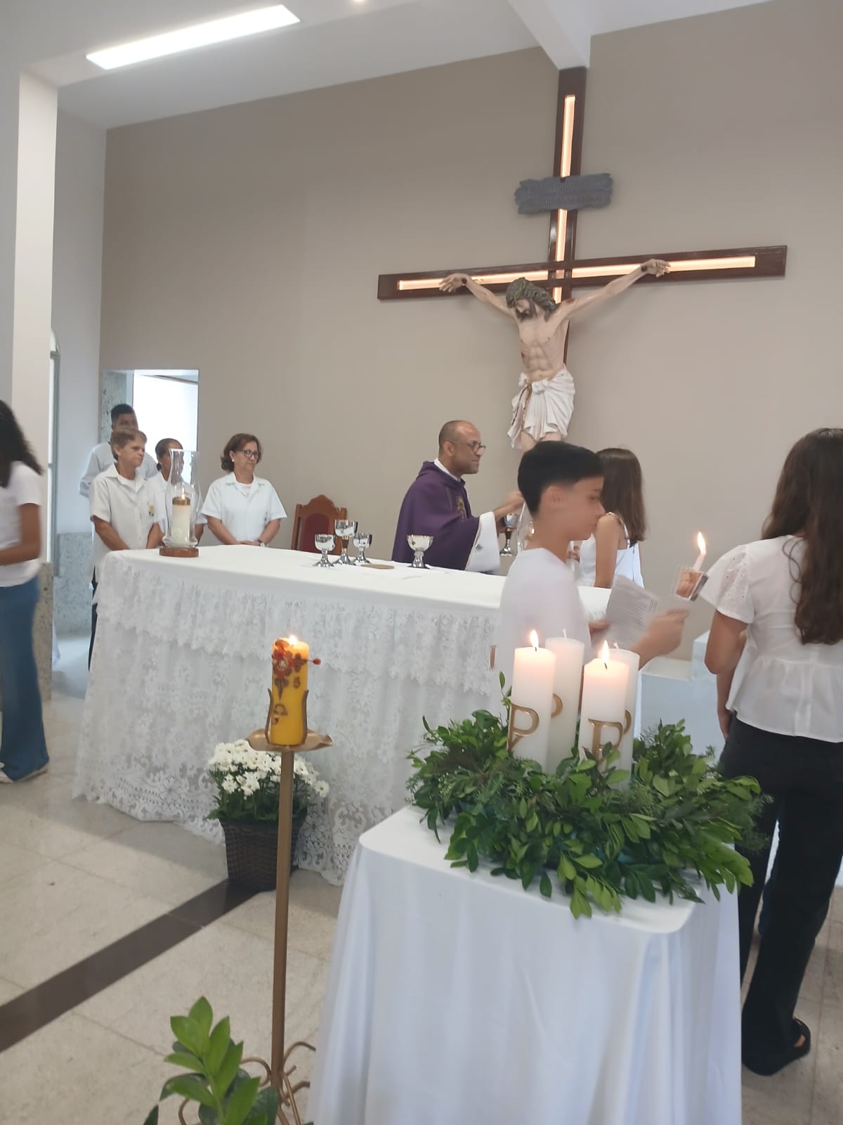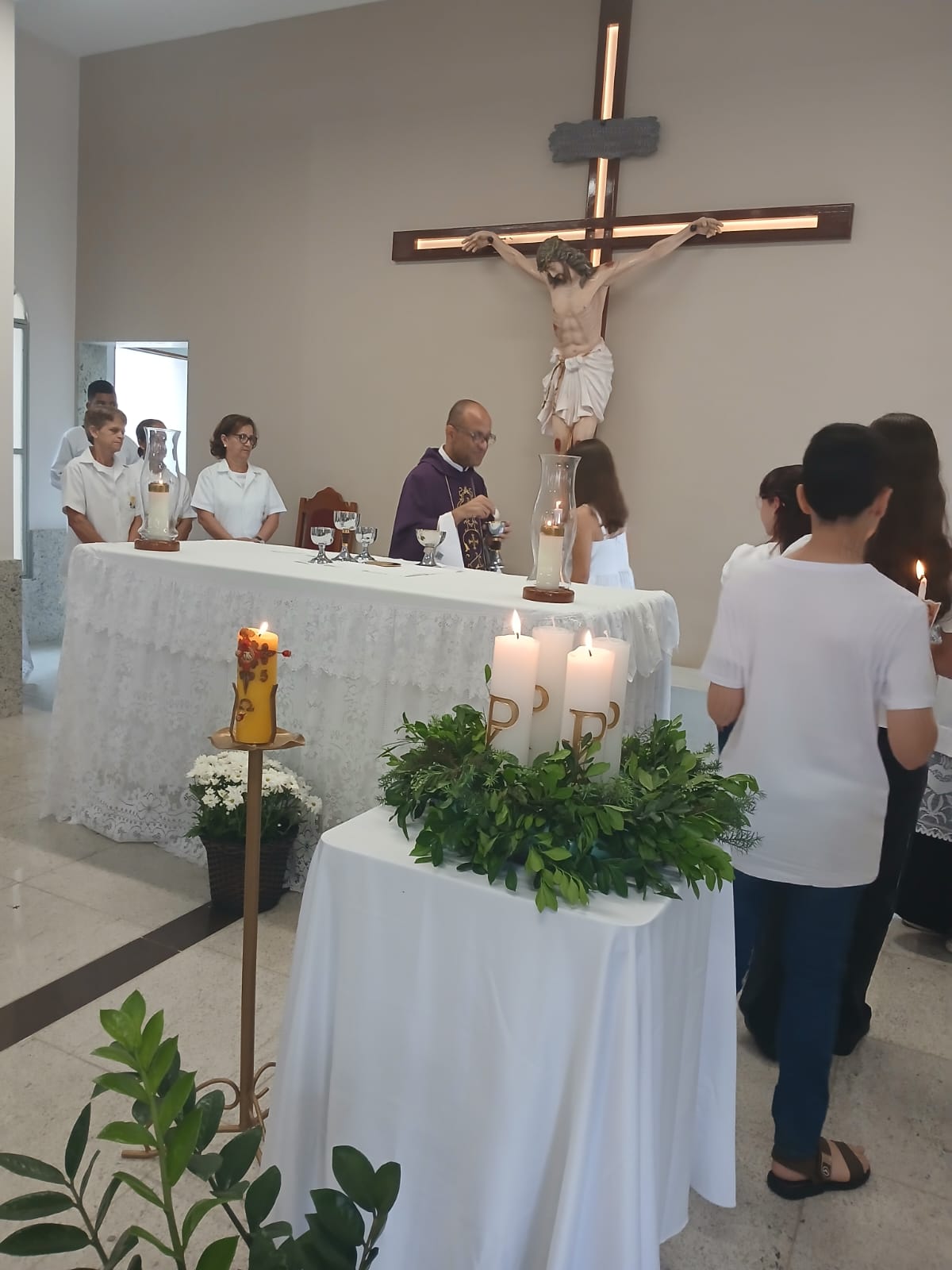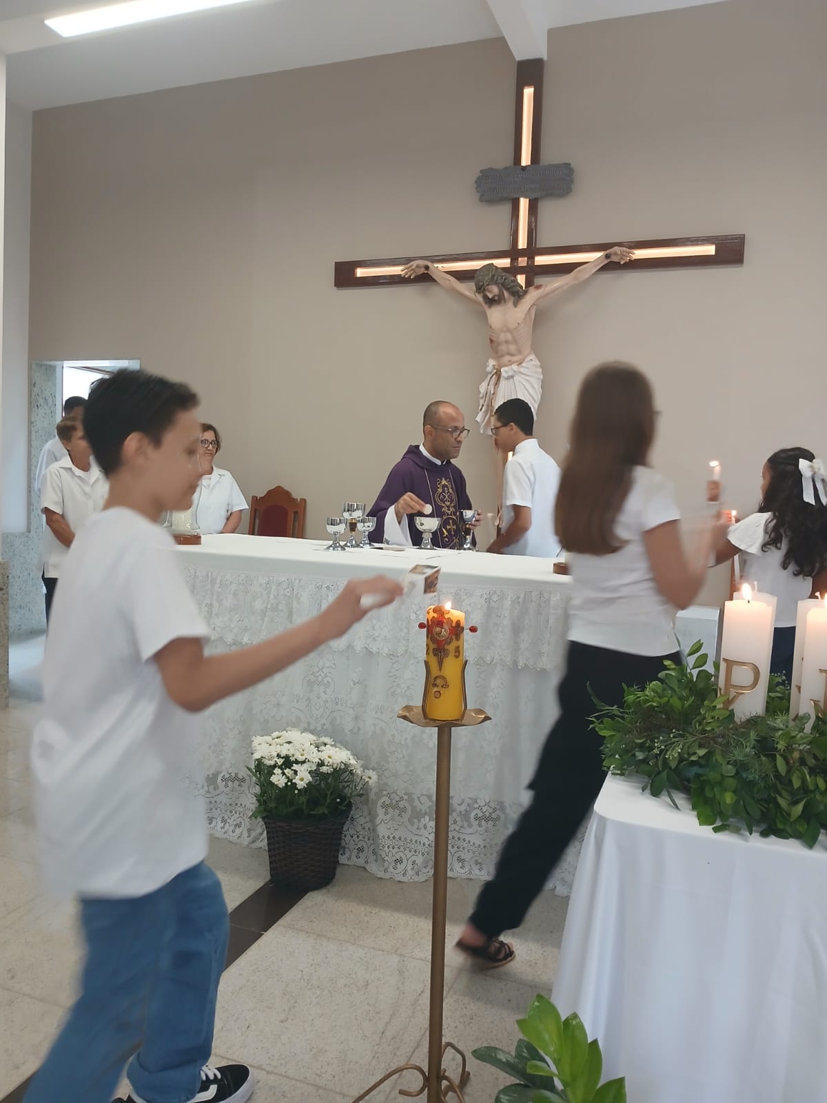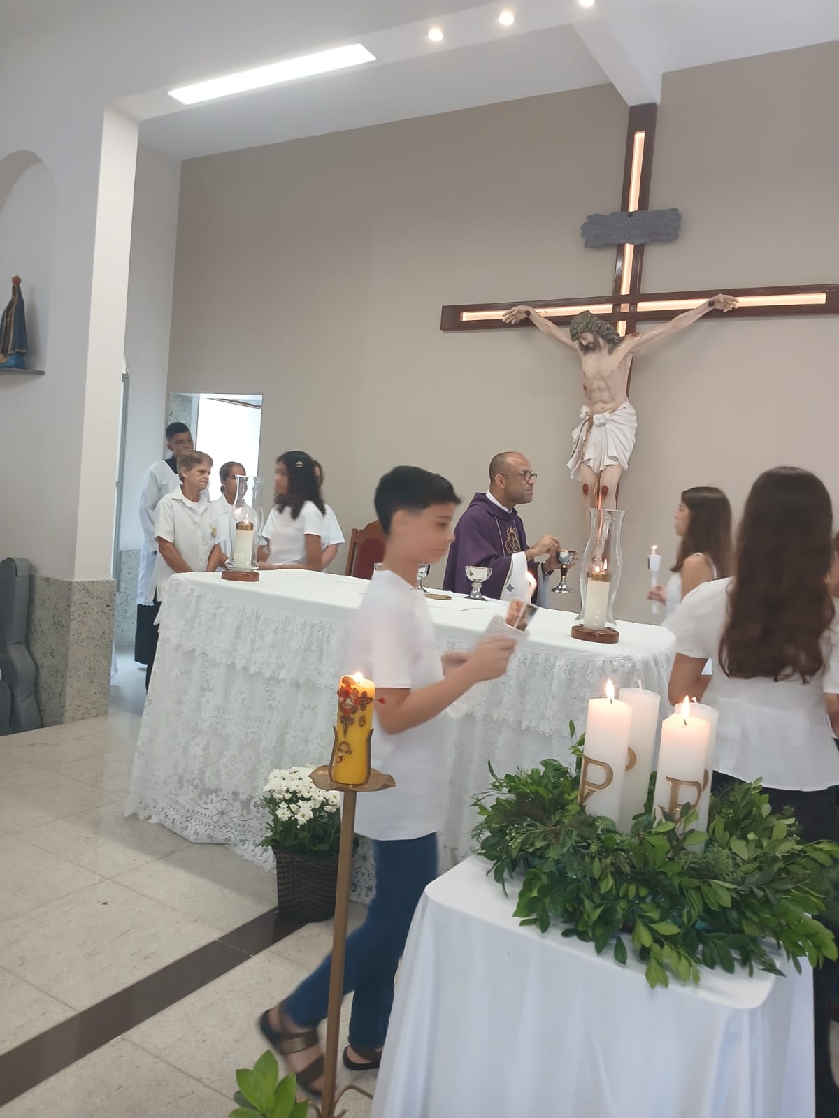 A Santa Missa, realizada às 07h30 na Igreja Matriz e presidida pelo Padre Elinei, foi um momento de grande graça, onde a comunidade paroquial se reuniu para testemunhar o encontro de cada criança com Jesus Eucarístico.
