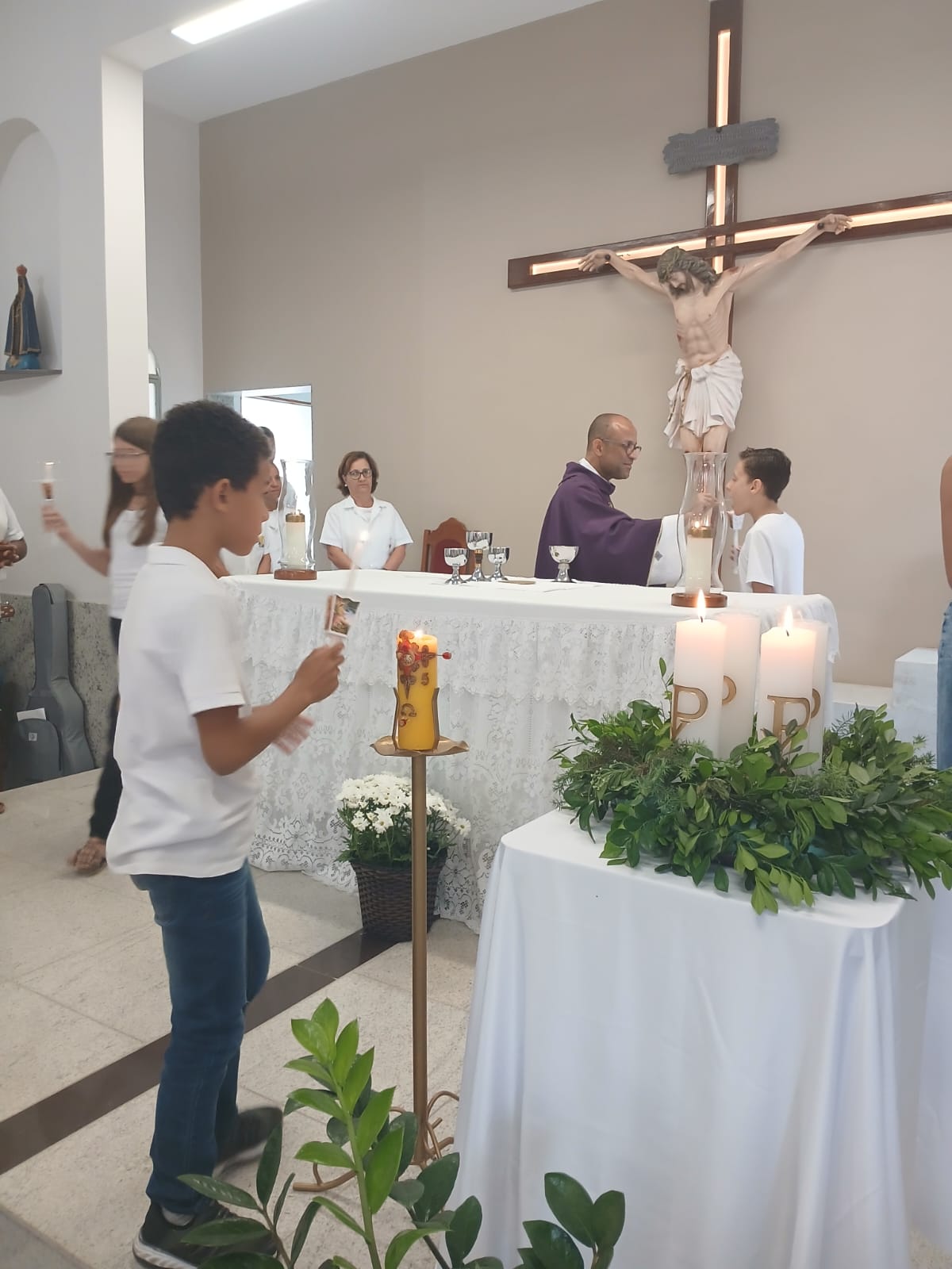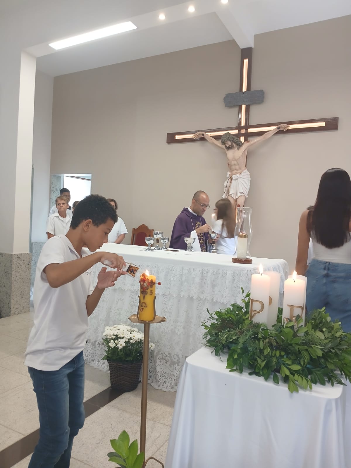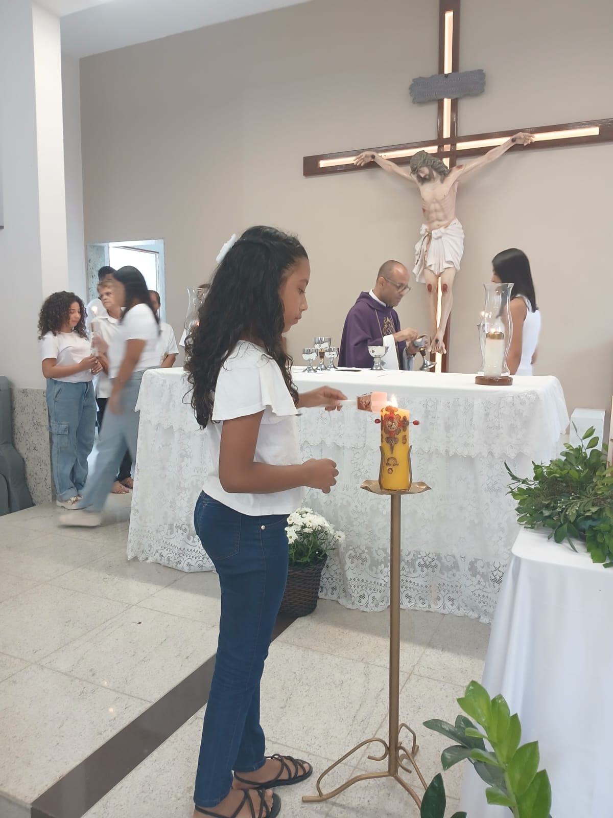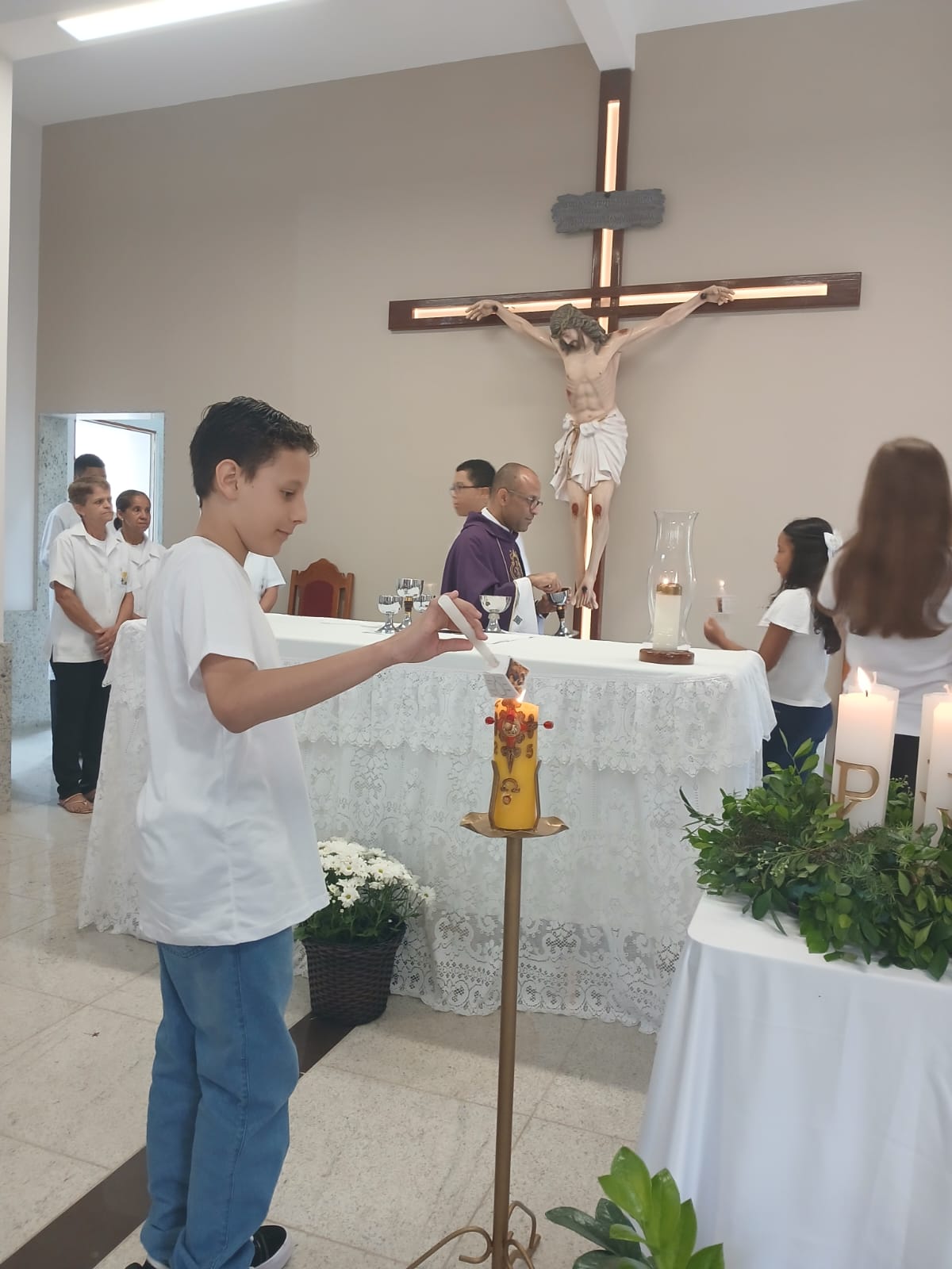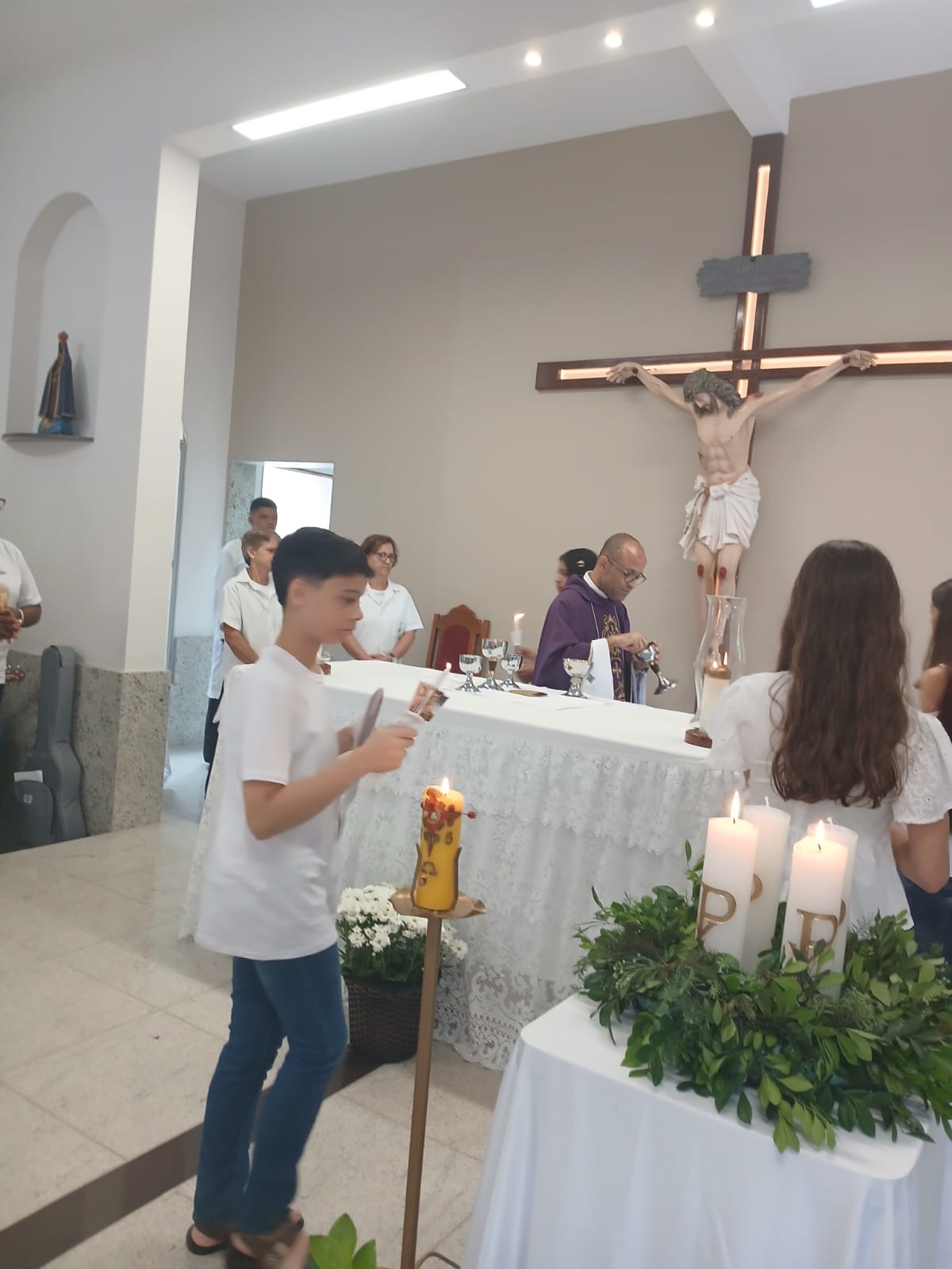 A Santa Missa, realizada às 07h30 na Igreja Matriz e presidida pelo Padre Elinei, foi um momento de grande graça, onde a comunidade paroquial se reuniu para testemunhar o encontro de cada criança com Jesus Eucarístico.