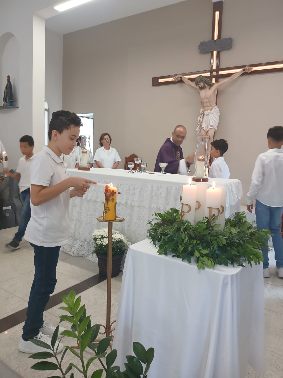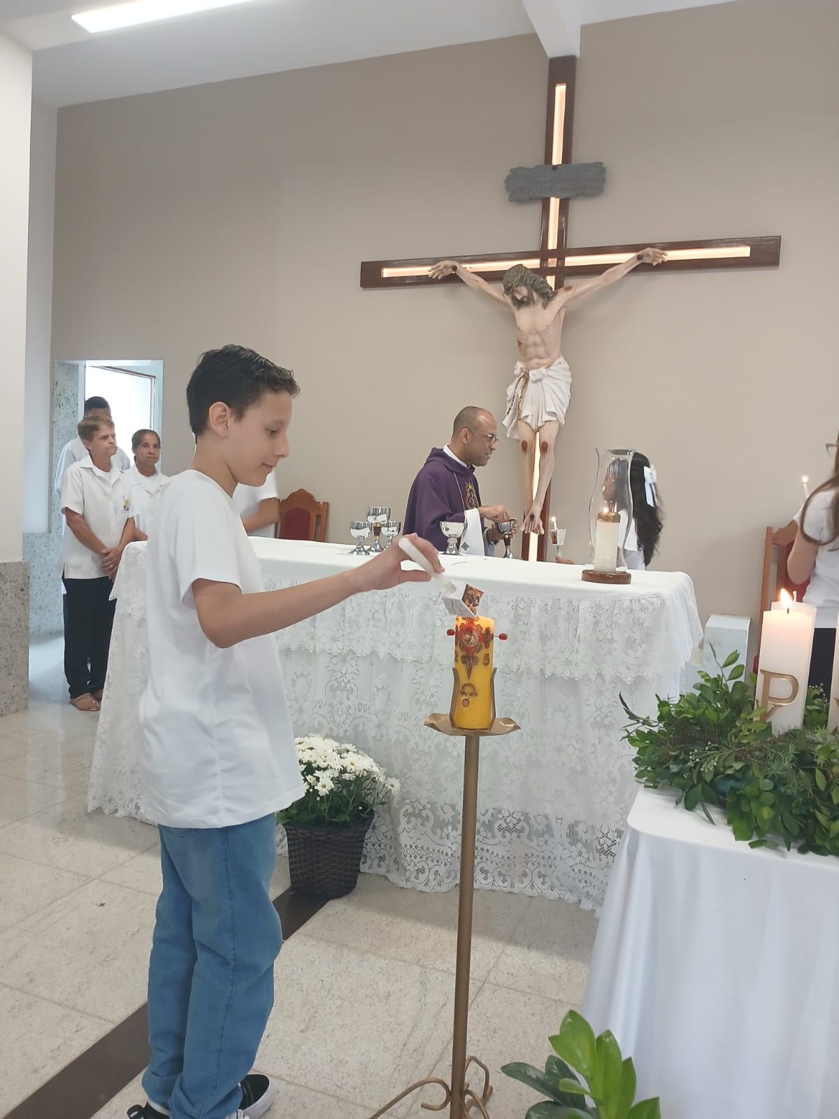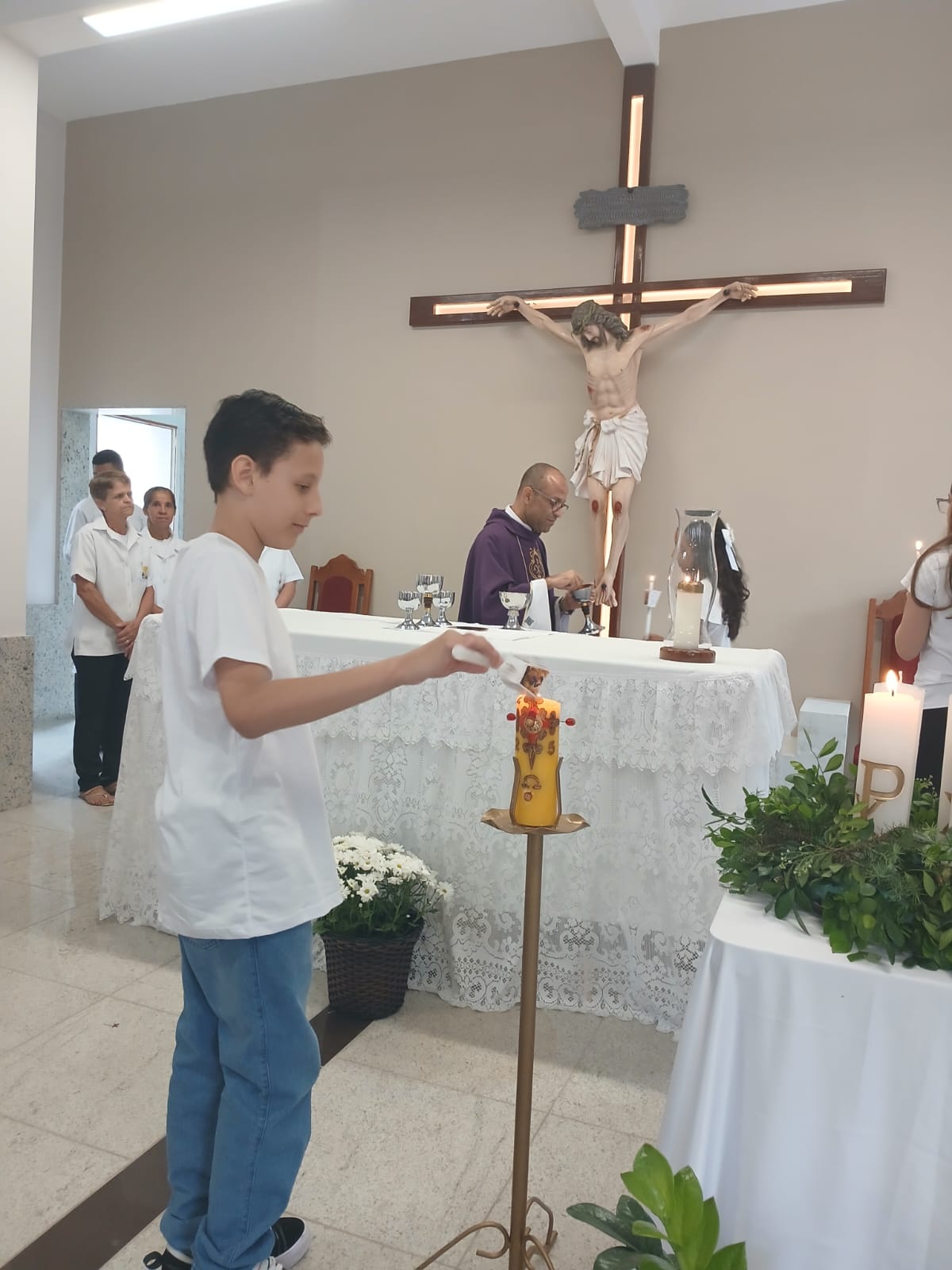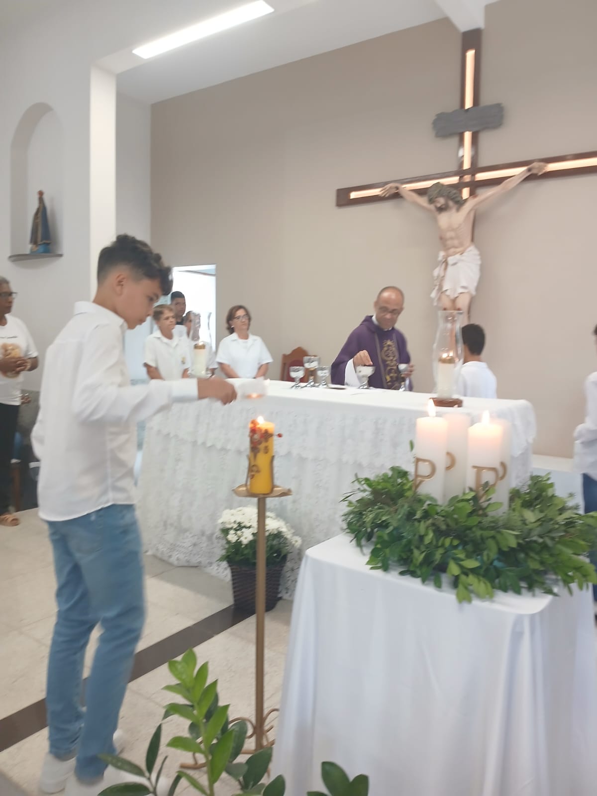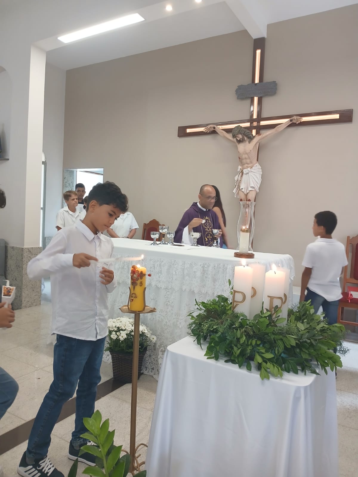 A Santa Missa, realizada às 07h30 na Igreja Matriz e presidida pelo Padre Elinei, foi um momento de grande graça, onde a comunidade paroquial se reuniu para testemunhar o encontro de cada criança com Jesus Eucarístico.