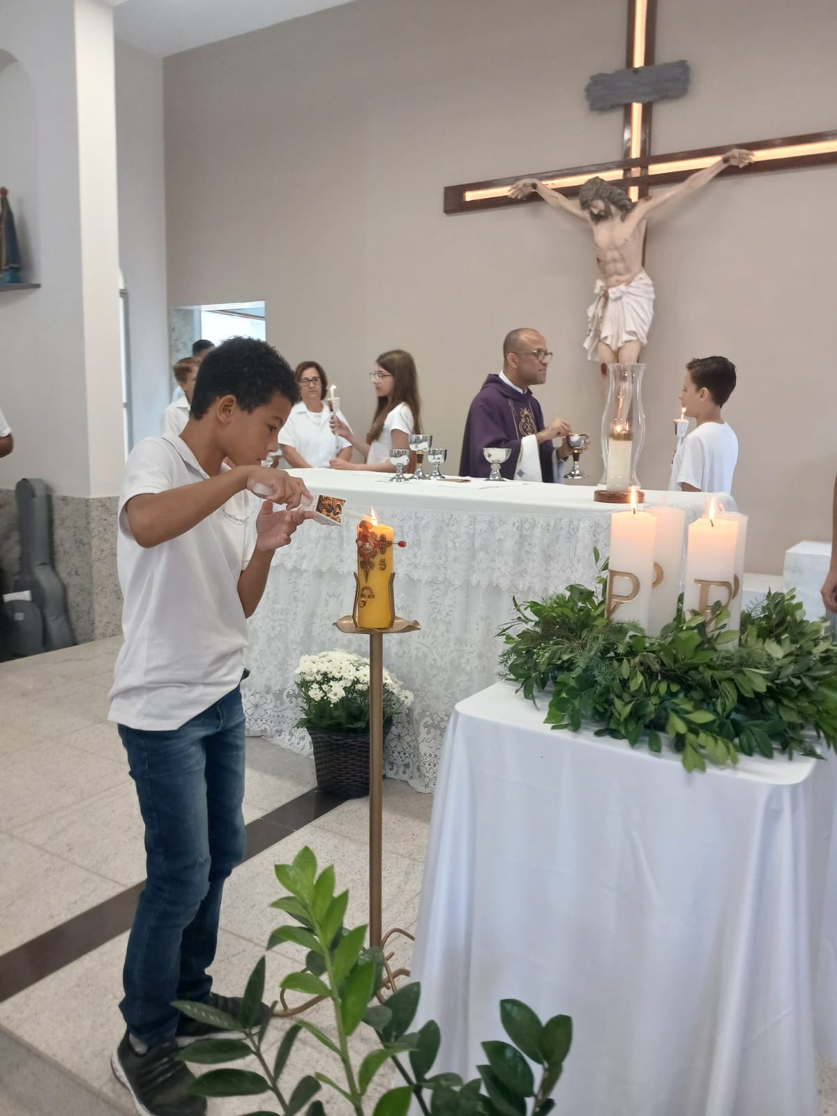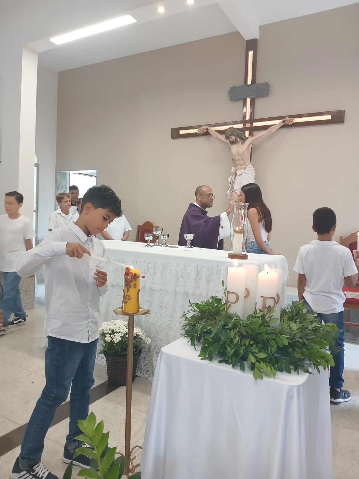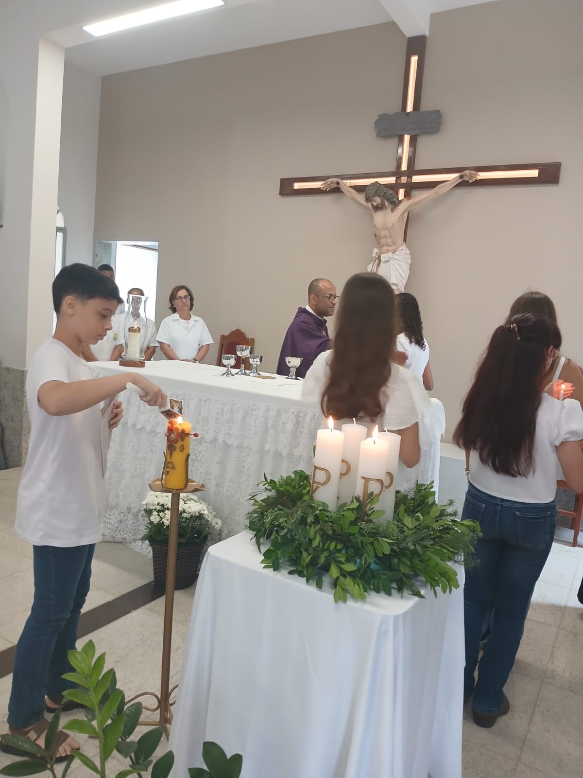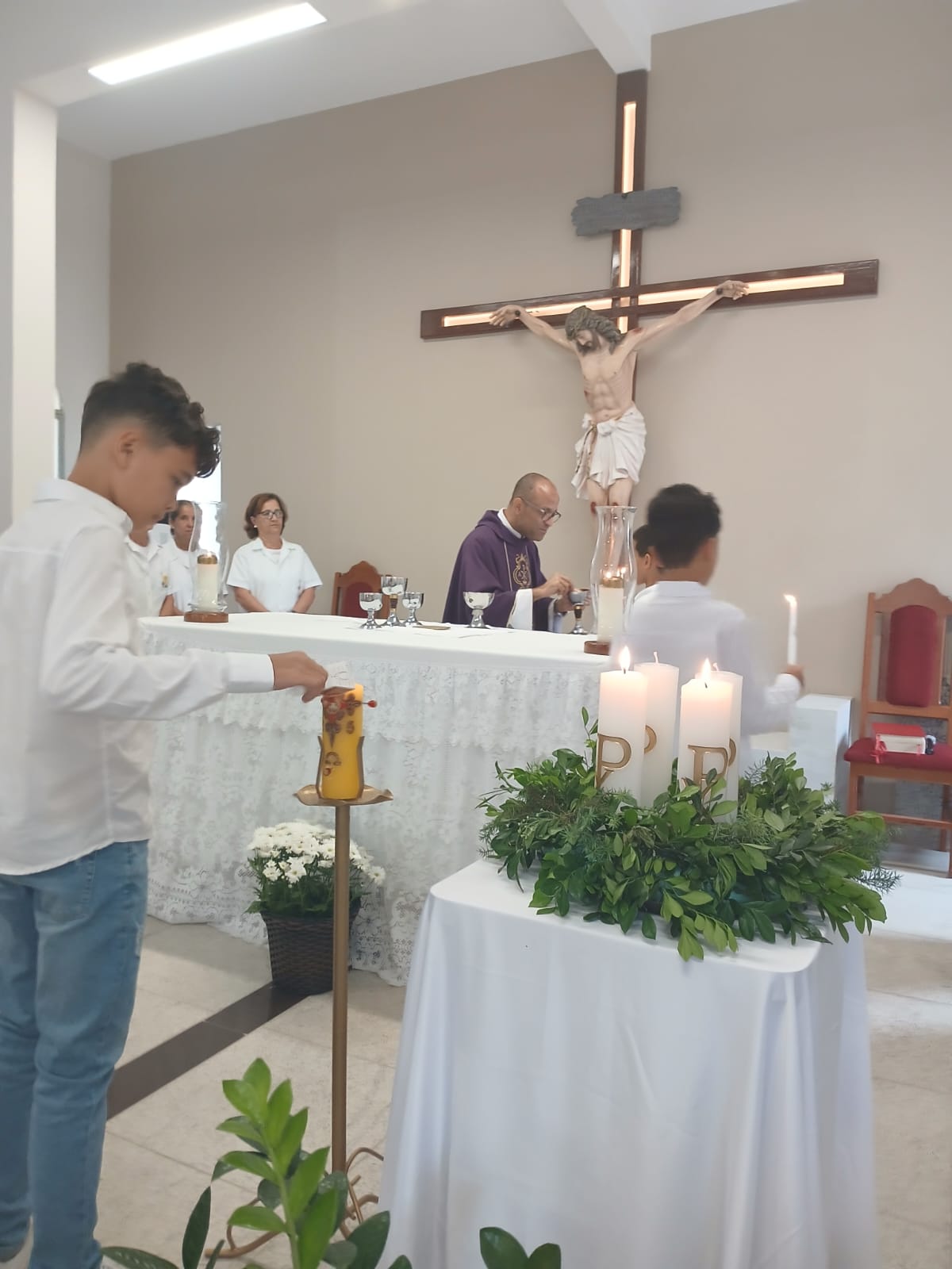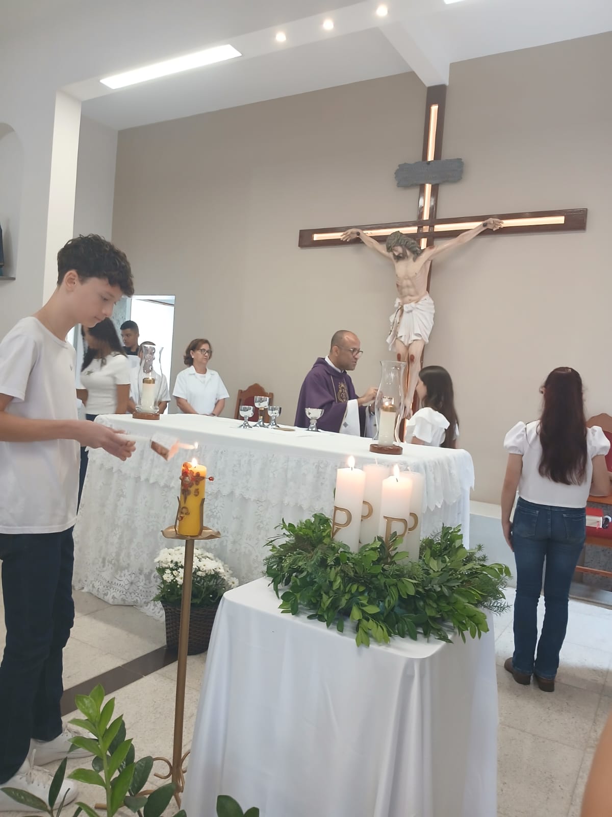 A Santa Missa, realizada às 07h30 na Igreja Matriz e presidida pelo Padre Elinei, foi um momento de grande graça, onde a comunidade paroquial se reuniu para testemunhar o encontro de cada criança com Jesus Eucarístico.