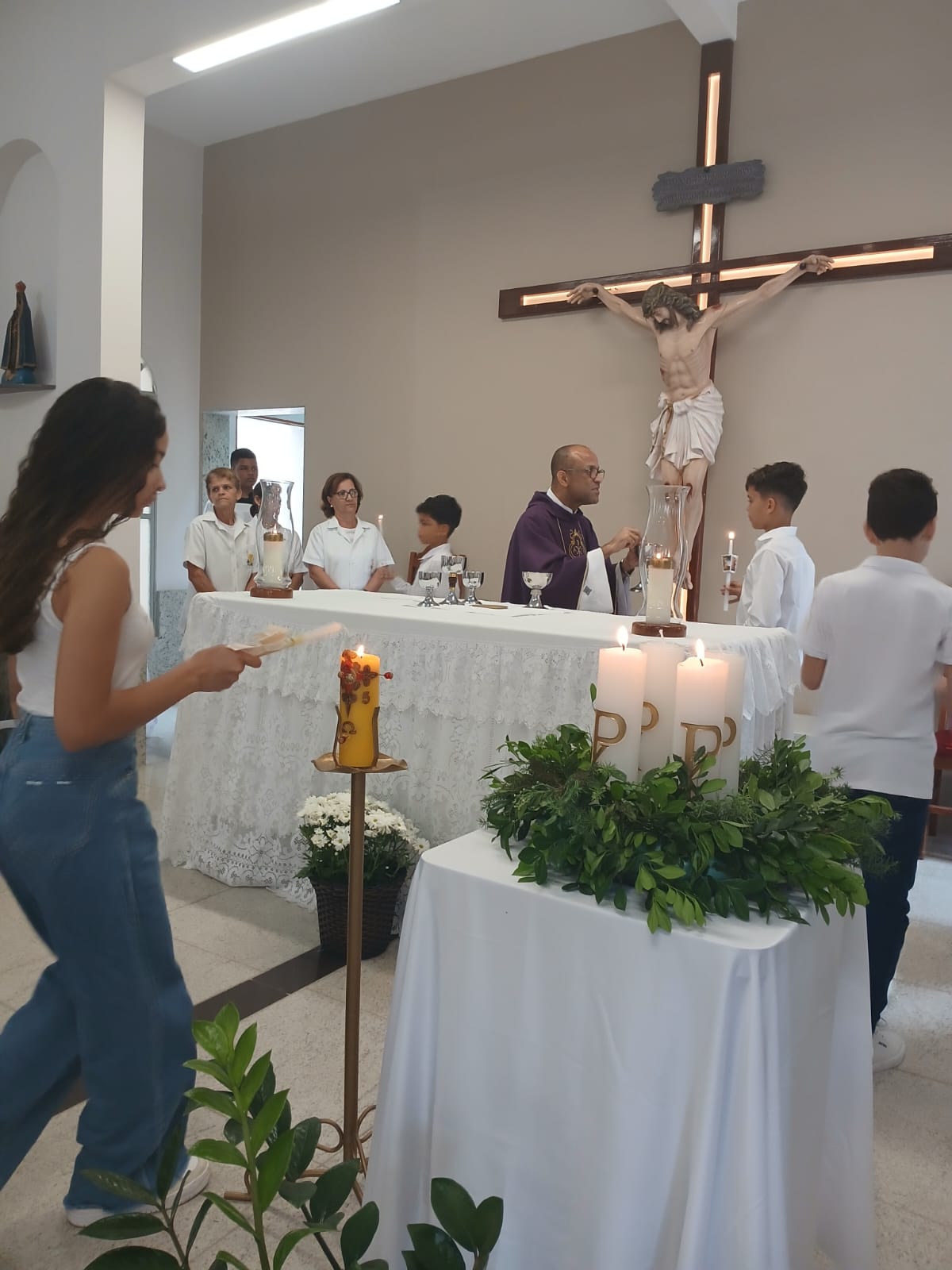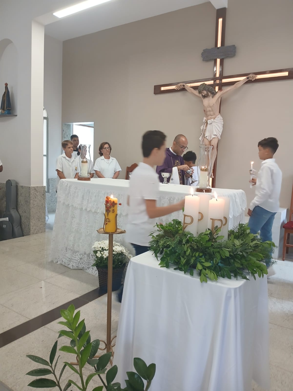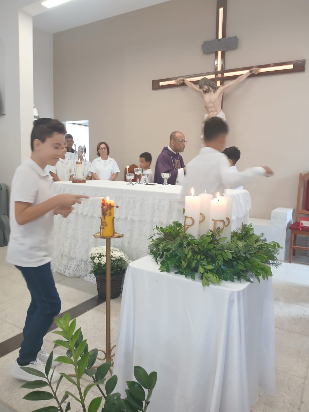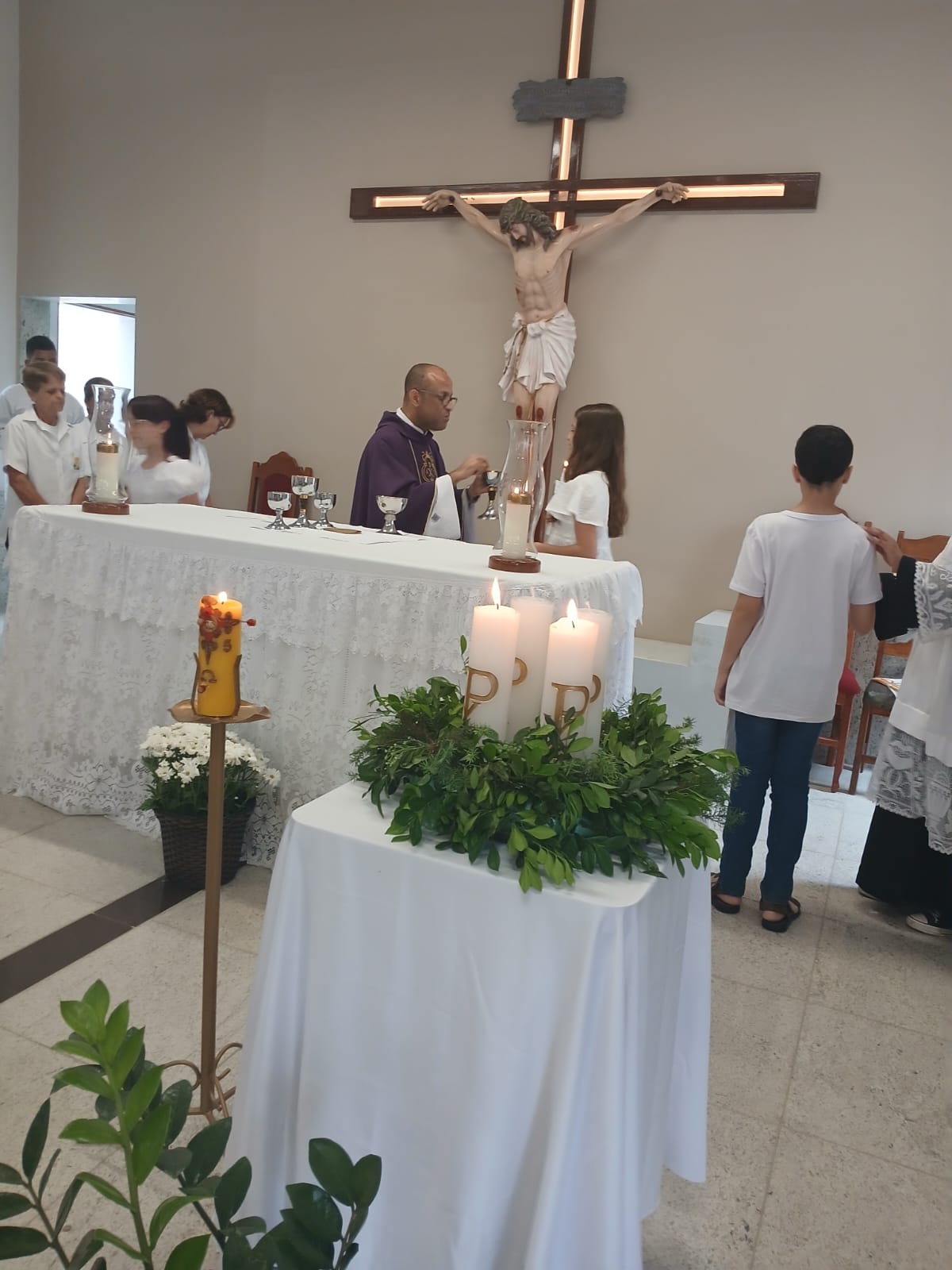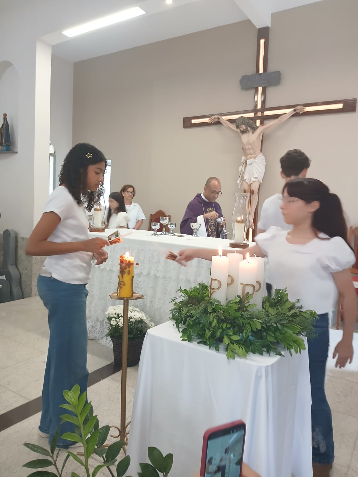A Santa Missa, realizada às 07h30 na Igreja Matriz e presidida pelo Padre Elinei, foi um momento de grande graça, onde a comunidade paroquial se reuniu para testemunhar o encontro de cada criança com Jesus Eucarístico.