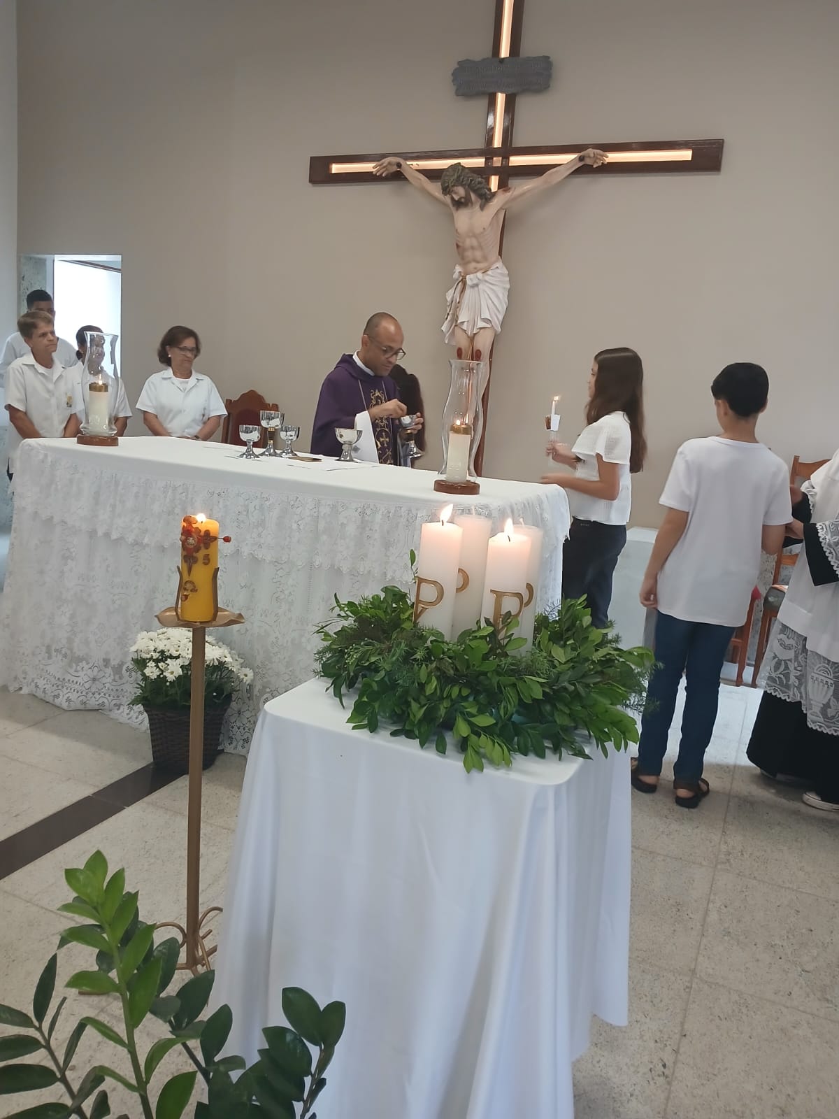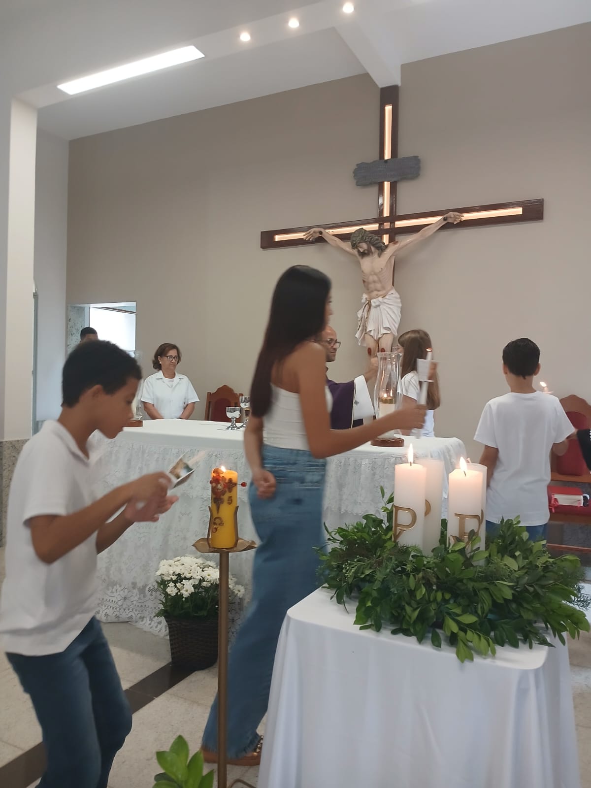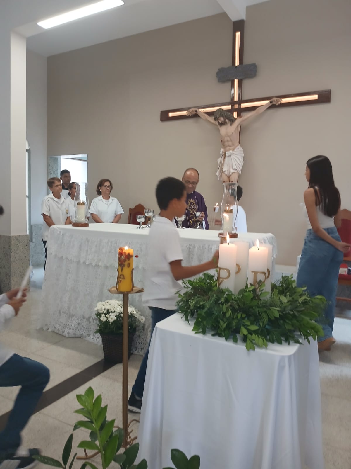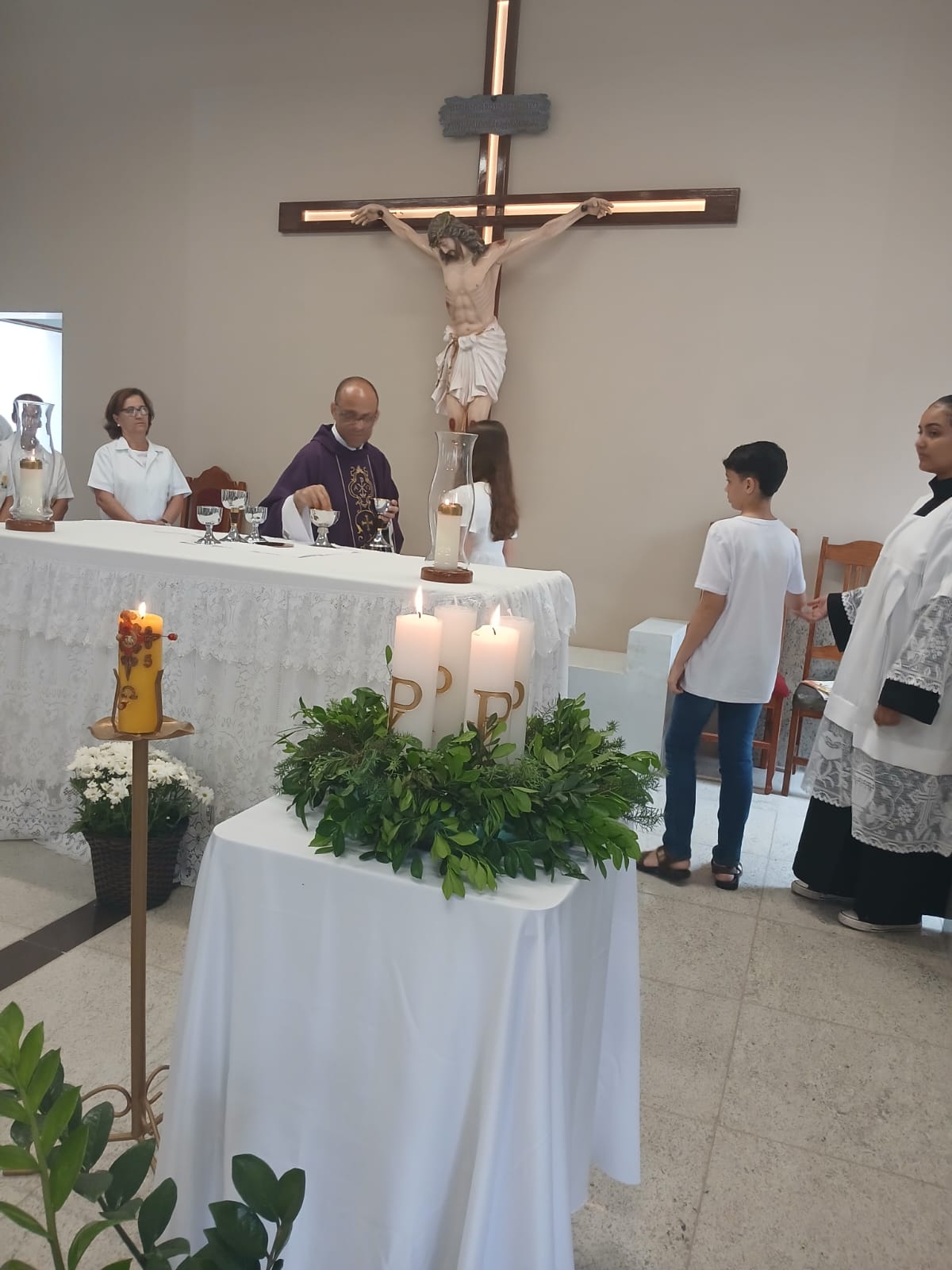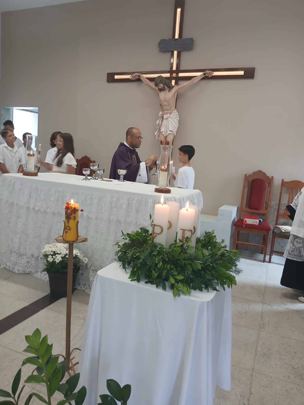 A Santa Missa, realizada às 07h30 na Igreja Matriz e presidida pelo Padre Elinei, foi um momento de grande graça, onde a comunidade paroquial se reuniu para testemunhar o encontro de cada criança com Jesus Eucarístico.