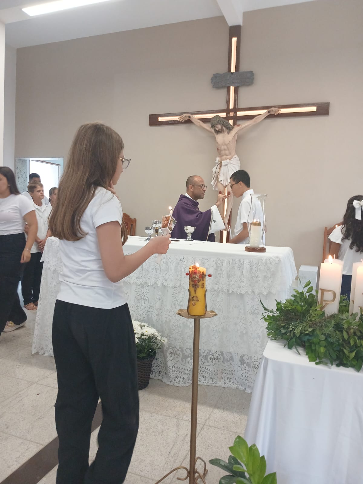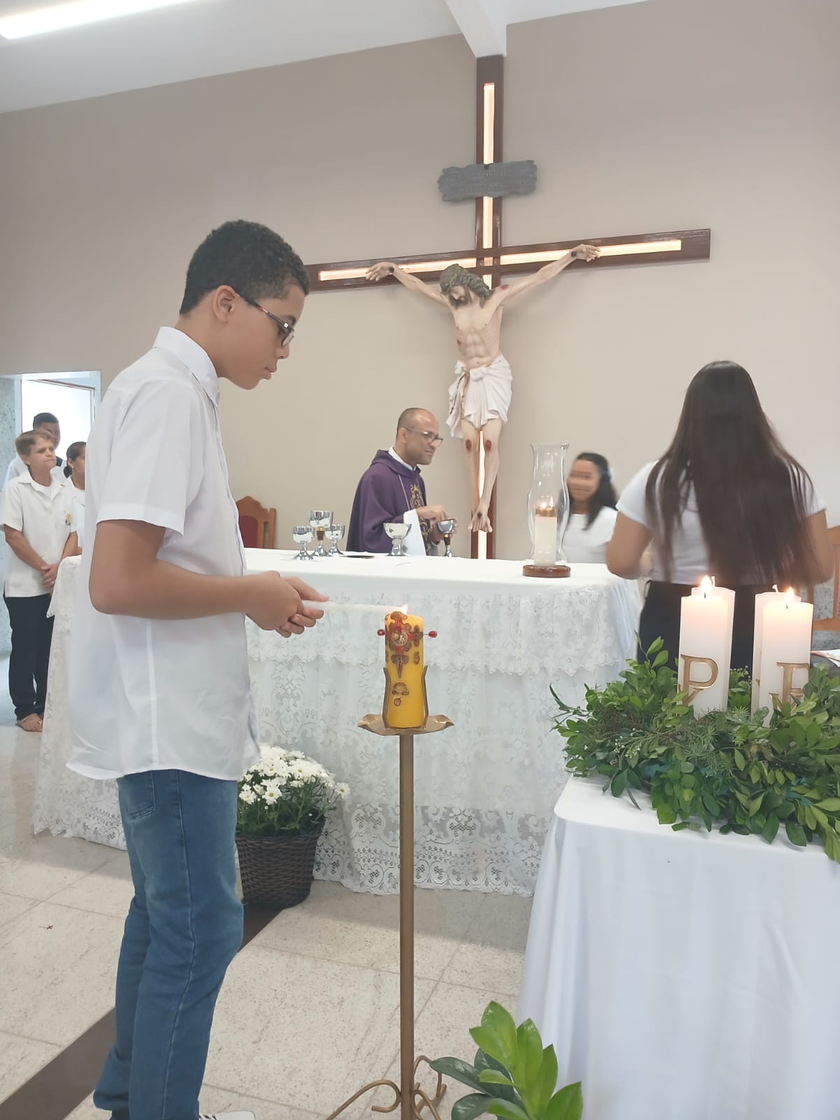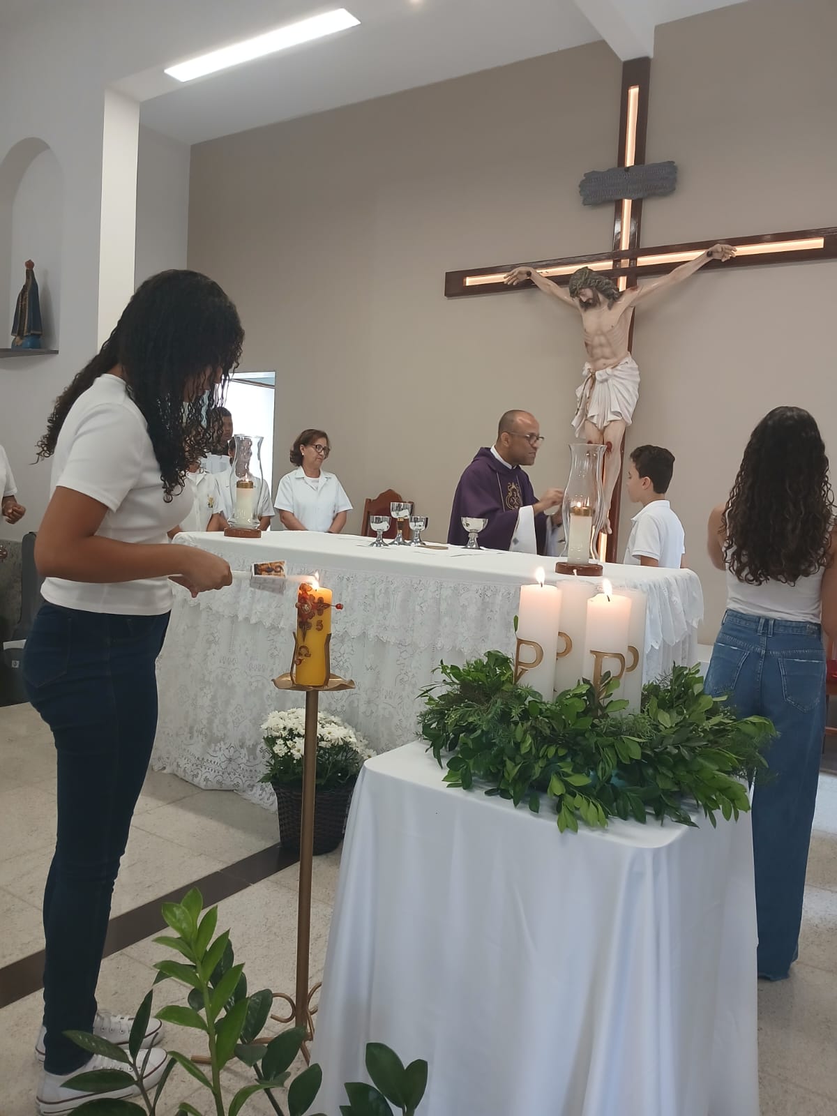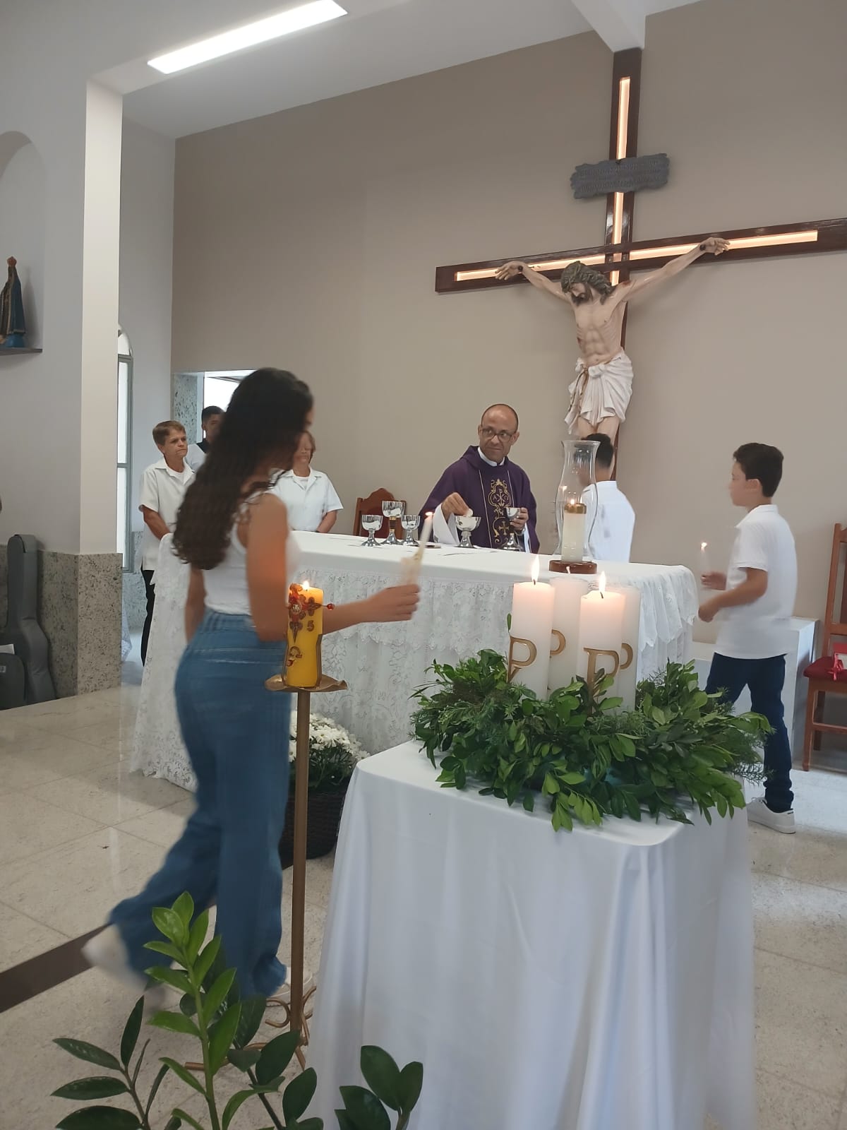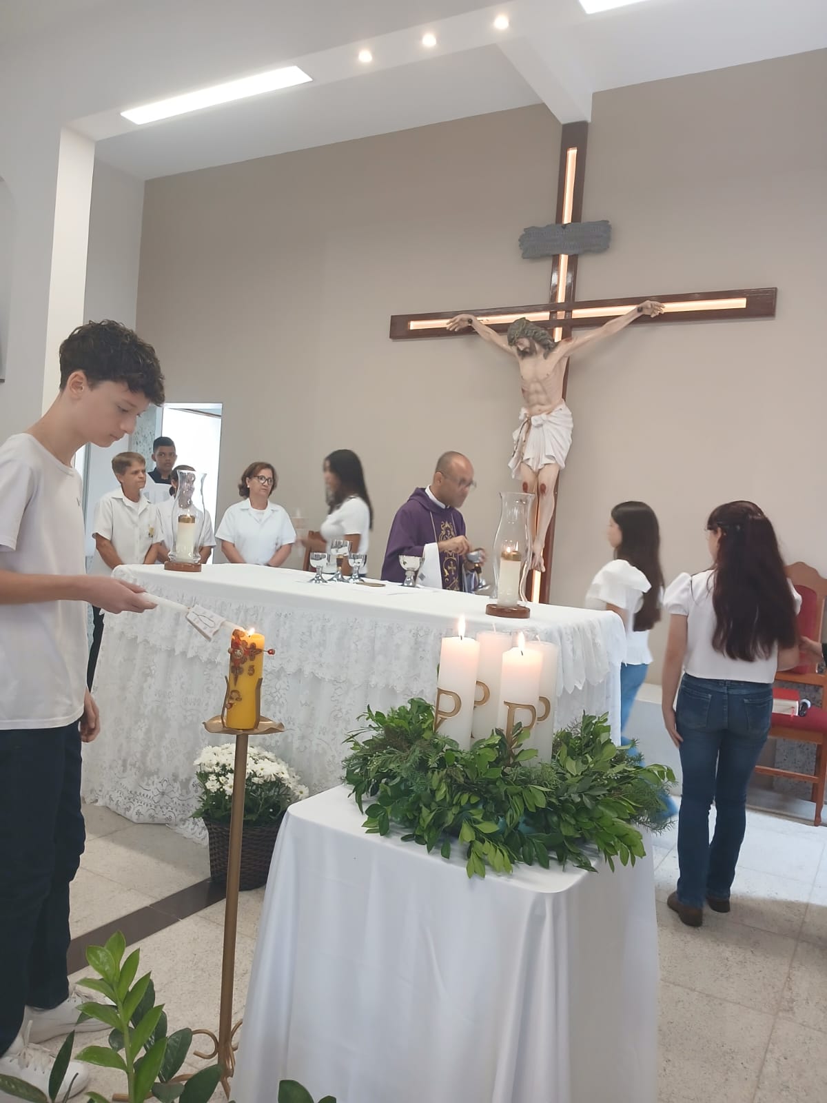A Santa Missa, realizada às 07h30 na Igreja Matriz e presidida pelo Padre Elinei, foi um momento de grande graça, onde a comunidade paroquial se reuniu para testemunhar o encontro de cada criança com Jesus Eucarístico.
