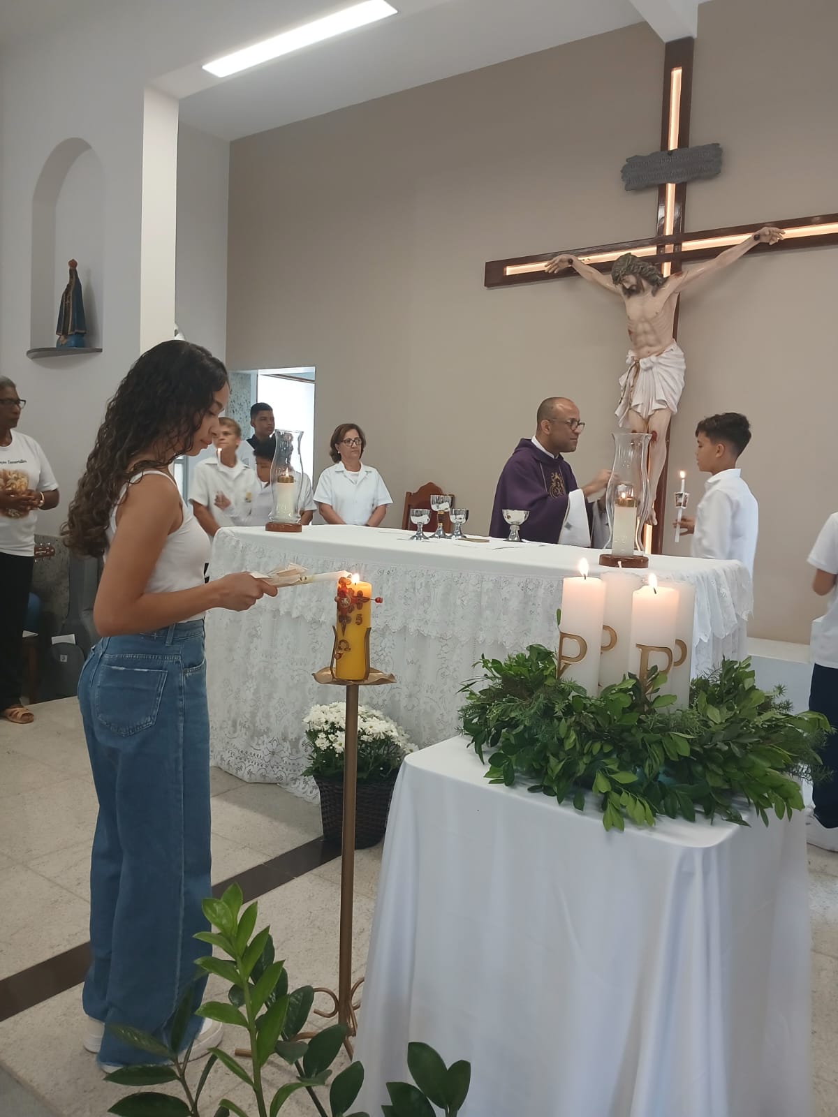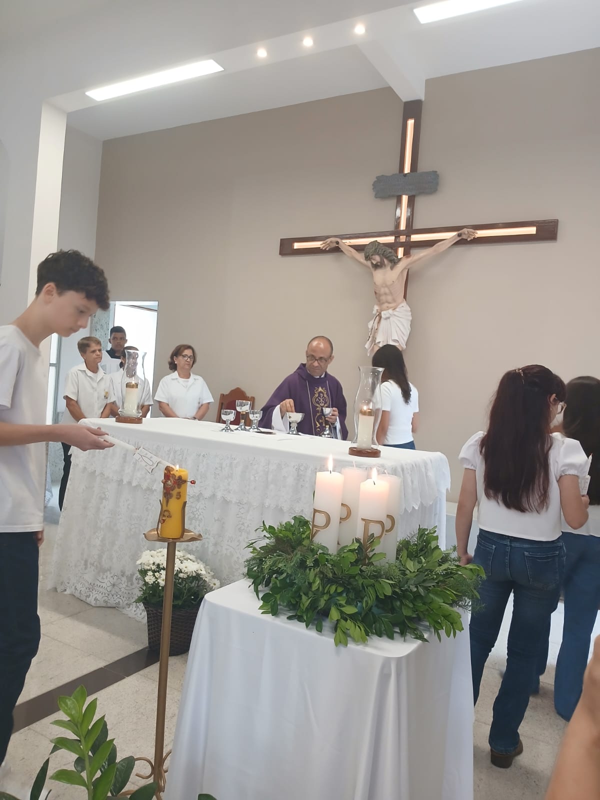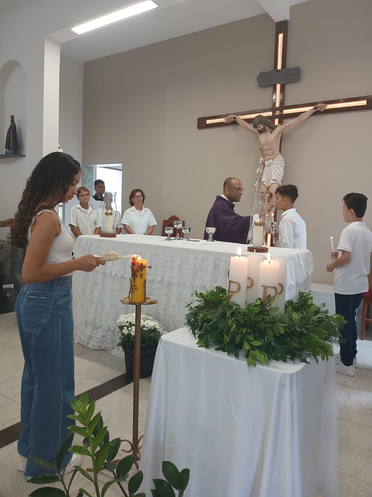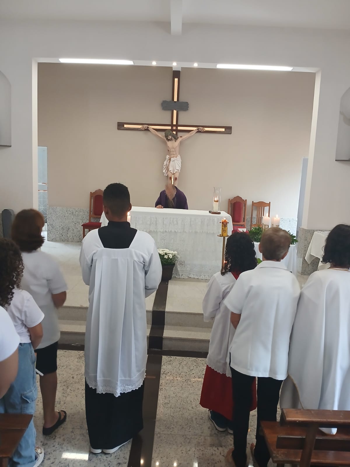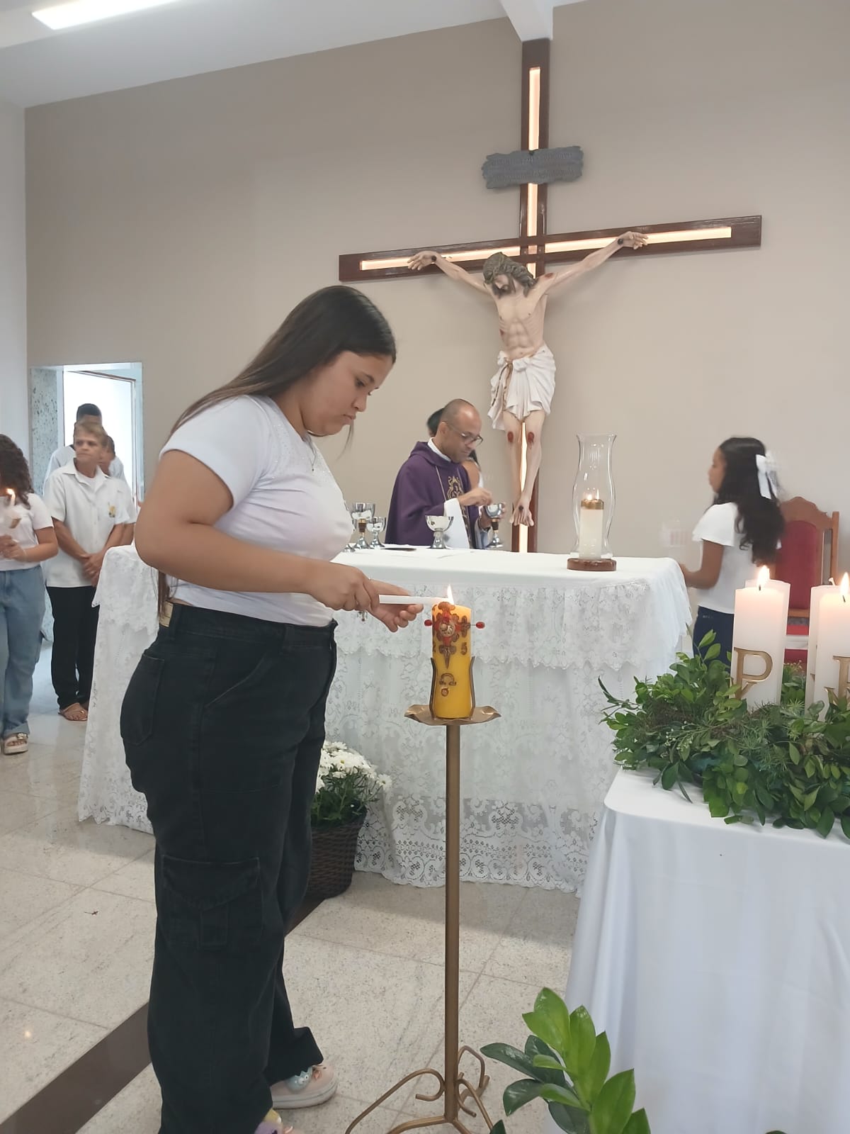 A Santa Missa, realizada às 07h30 na Igreja Matriz e presidida pelo Padre Elinei, foi um momento de grande graça, onde a comunidade paroquial se reuniu para testemunhar o encontro de cada criança com Jesus Eucarístico.