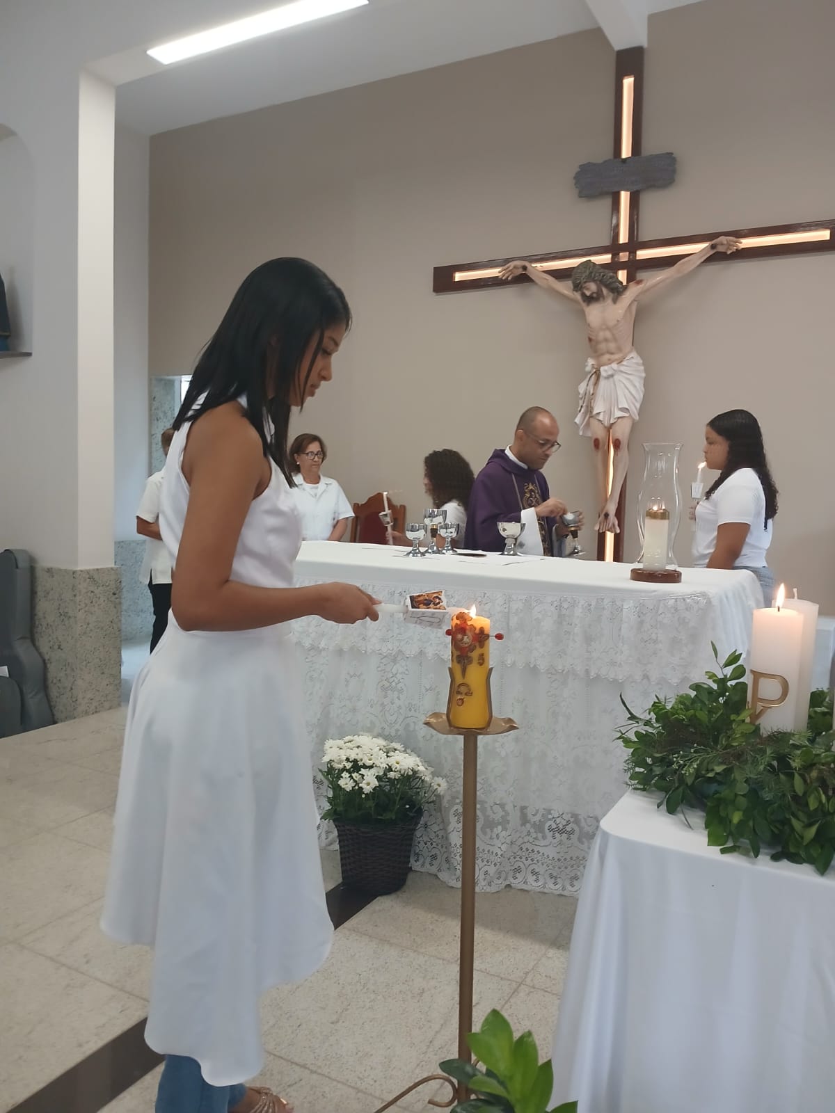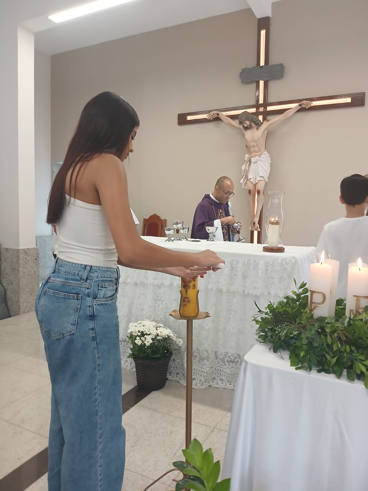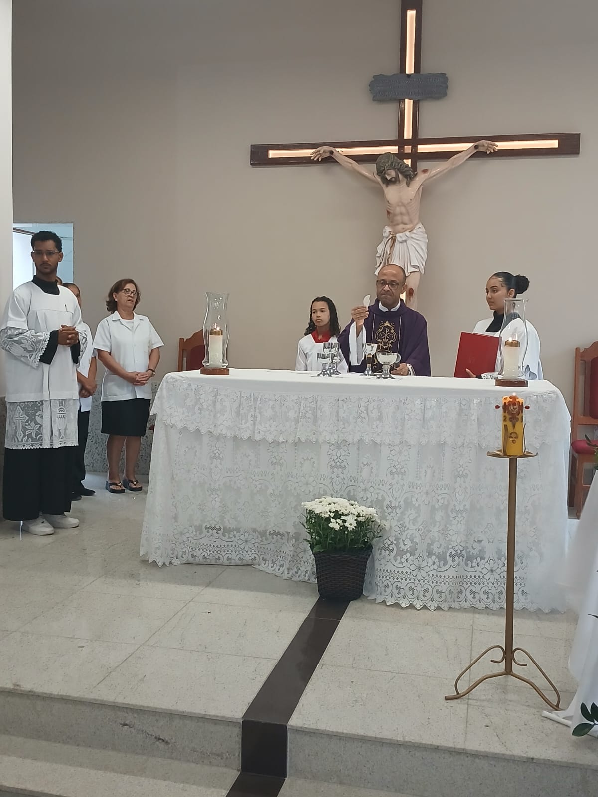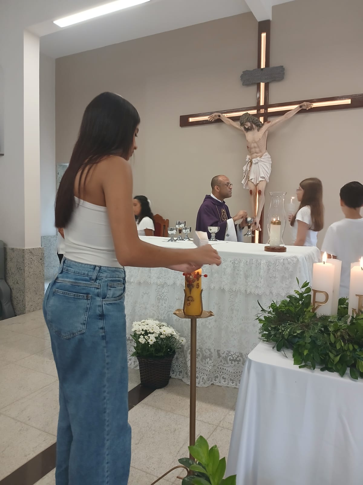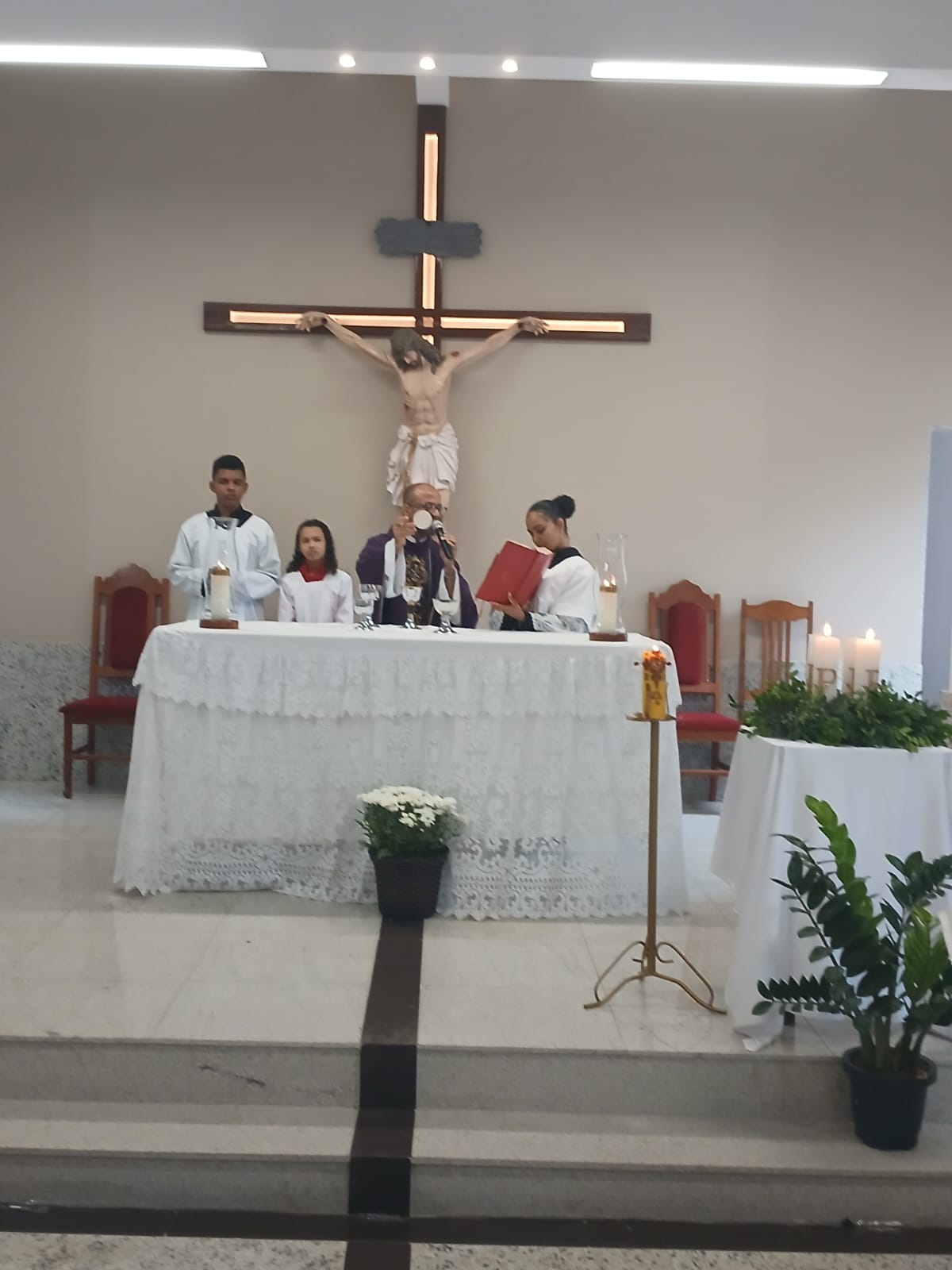 A Santa Missa, realizada às 07h30 na Igreja Matriz e presidida pelo Padre Elinei, foi um momento de grande graça, onde a comunidade paroquial se reuniu para testemunhar o encontro de cada criança com Jesus Eucarístico.